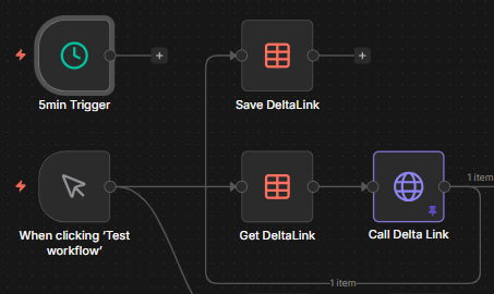 This is a whole seperate section because you need to have the Delta Link saved to a permenate place to be pulled and replace. I use the n8n DataTable. I have also used SharePoint Lists - but authentification can get wierd with calling it so often. So after you call your Delta Link, replace the one in your store with the new Delta Link that is returned.